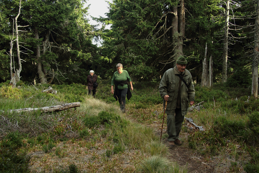 Ráno mám problém se vstáváním. Z chaty vycházím až kolem půl sedmé. Sluníčko se přehouplo přes horu, světla rázem přibývalo, jen ten zatracený vítr se pořád točí. Mělo foukat od východu, to by mi vyhovovalo. Cesta, po které jdu tak jako včera, stoupá a stáčí se hned do prava a pak vlevo. Dnes ovšem z cesty odbočuji za druhou zatáčkou. Moc mě to láká podívat se, jak to vypadá za kopcem vedle cesty. Jen co zdolám horizont kopce, oči mi přebíhají z místa na místo. Nádherné, malé, sytě zelené smrčky, mezi nimi vzrostlé vysoké keře borůvčí v tom všem staré, léty větrem ošlehané bez kůry ležící stromy. Úchvatnou podívanou umocňuje nízké slunce, které celému pralesnímu porostu dodává nádherné barvy. Nemohu se od nevšední podívané odpoutat a vrátit se zpátky na cestu.