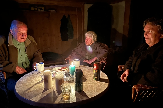 Po přípitcích Jirka s Milenou jdou na malou procházku. Já zůstávám na chatě u svých fotek a začínám jen malou úpravou v noťasu. Janička mezi tím chystá lehký oběd. Ten den v úterý podvečer nás poctil návštěvou Jirka Šikl. Persona v dlouhém hubertusu s prošedivělým plnovousem slézá z motorky, rozevírá ruce na přivítanou. Je to opravdu chlap, pořád se smějící se skvělou náladou, prostě veselá kopa. Skvělá zábava při troše šnapsu rychle utíkala. Povykládal nám mnoho historek ze svého života, my pozadu nezůstali. Nechyběl ani můj výklad z ranního setkání s jeleny. Rád se Jirka na fotky podíval, hned hodnotil; odstřelový jsou oba, jak tříletý vidlák, tak i čtyřletý, nerovný osmerák. Já to vím také, ale mám je raději na fotce. Den se začal ukládat ke spánku. Jirka oblékl svůj hubertus dlouhý, až skoro ke kotníkům, rozloučil se a odjel. My donuceni chladem a padající tmou se přestěhovali do chaty. V posezení při světle svíček jsme pokračovali do půlnoci. Až celodenní únava si u každého začala vyžadovat pozornost, teprve potom se odebíráme ke spánku. Zítra určitě budeme při malém svitu svíček v posezení pokračovat.