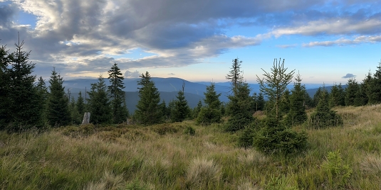 Ráno mám problém se vstáváním. Z chaty vycházím až kolem půl sedmé. Sluníčko se přehouplo přes horu, světla rázem přibývalo, jen ten zatracený vítr se pořád točí. Mělo foukat od východu, to by mi vyhovovalo. Cesta, po které jdu tak jako včera, stoupá a stáčí se hned do prava a pak vlevo. Dnes ovšem z cesty odbočuji za druhou zatáčkou. Moc mě to láká podívat se, jak to vypadá za kopcem vedle cesty. Jen co zdolám horizont kopce, oči mi přebíhají z místa na místo. Nádherné, malé, sytě zelené smrčky, mezi nimi vzrostlé vysoké keře borůvčí v tom všem staré, léty větrem ošlehané bez kůry ležící stromy. Úchvatnou podívanou umocňuje nízké slunce, které celému pralesnímu porostu dodává nádherné barvy. Nemohu se od nevšední podívané odpoutat a vrátit se zpátky na cestu.